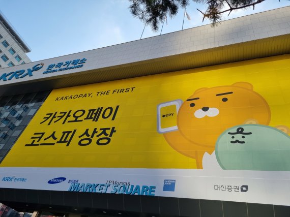지난해 카카오페이의 코스피 신규 상장일에 서울 여의도 한국거래소에서 기념 현수막이 걸려 있다. 뉴스1 제공