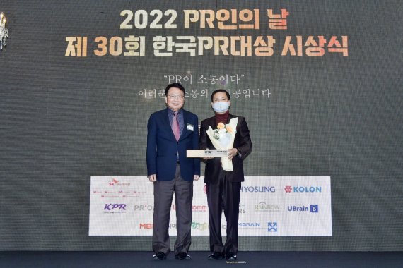 지난 22일 '2022 PR인의 날 및 한국PR대상' 시상식에서 SK이노베이션 밸류크리에이션센터 박현섭 PL(오른쪽)이 한국PR대상 운영위원회 위원장 신호창 서강대 교수와 기념촬영을 하고 있다. SK이노베이션 제공