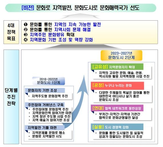 ‘대한민국 문화도시 추진계획’은 제1단계 문화도시(2018~2022년) 정책성과를 더욱 발전시켜, △고유성에 기반한 지역문화자치 확대, △누구나 누리는 공정한 문화 환경 조성, △협력 네트워크로 지역 동반 성장, △실질적 성과 창출의 가치를 강조하는 ‘대한민국 문화도시’를 지정해 제2단계 문화도시(2023~2027년) 사업을 이어 나간다.