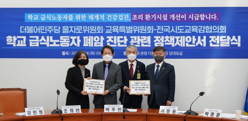 민주당은 전국시도교육감협의회에 △급식노동자 폐암 건강검진 대상확대 및 검진 신속 시행 △조리기구 환기 시설에 대한 전수 실태조사와 개선사업 예산 편성 확대 △고용부, 교육부, 시도기관협의회, 한국산업안전보건공단 등 관계기관 참여 TF팀 구성을 제안했다.