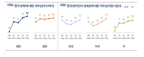 응답자들은 '한국인', '한류 문화' 등에 대해 높은 자부심을 보였다. 특히 한국 대중문화에 대해 '우수하다'라고 답한 비율은 96.6%로 2008년에 비해 43%포인트 상승했는데, 이는 조사 이후 가장 높은 수치다. 한국 전통문화에 대해 '우수하다' 95.1%, '한국 사람이라는 것이 자랑스럽다' 89.8%, '우리나라는 살기 좋은 곳이다' 90.4%, '우리나라 역사가 자랑스럽다' 85%로 긍정 답변이 증가했다.