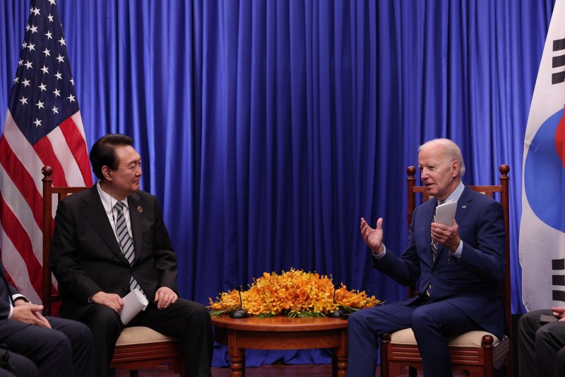 윤석열 대통령과 조 바이든 미국 대통령이 지난 11월 13일(현지시간) 캄보디아 프놈펜의 한 호텔에서 한미 정상회담을 하고 있다. 대통령실 제공