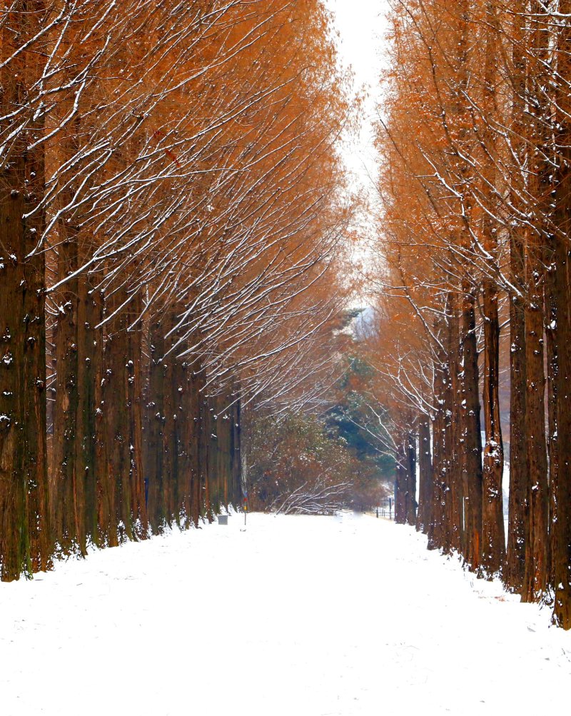 하늘공원 메타세쿼이아 길에 흰 눈이 소복이 내려