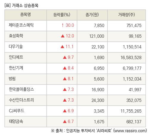 당일 상승한 종목의 수는 441개, 하락 398개, 보합 94개이다. 상승한 종목으로 제이준코스메틱(025620) 30.0%, 효성화학(298000) 12.0%, 다우기술(023590) 11.1% 등이 있다.