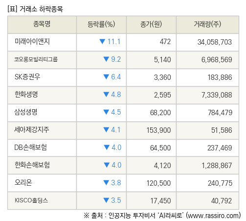 [fnRASSI]장마감, 거래소 하락 종목(미래아이앤지 -11.1% ↓)