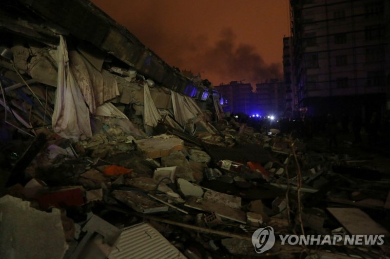 규모 7.8 강진으로 무너진 튀르키예 건물 (디야르바키르[튀르키예] 로이터=연합뉴스) 6일(현지시간) 규모 7.8의 강진이 발생한 튀르키예 남동부 디야르바키르에 건물이 붕괴해 있다. 로이터 등 외신에 따르면 이날 새벽 4시 17분께 남부 도시 가지안테프에서 약 33㎞ 떨어진 내륙에서 규모 7.8의 지진이 일어난 것으로 미국 지질조사국(USGS)이 밝혔다. 2023.02.06 ddy04002@yna.co.kr (끝)