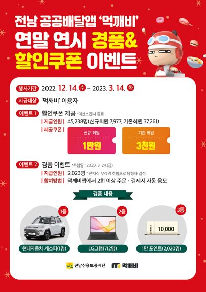 전남도가 공공배달앱 '먹깨비' 이용 활성화를 위해 오는 3월 14일까지 이용자를 대상으로 푸짐한 경품 이벤트를 진행하고 있다.