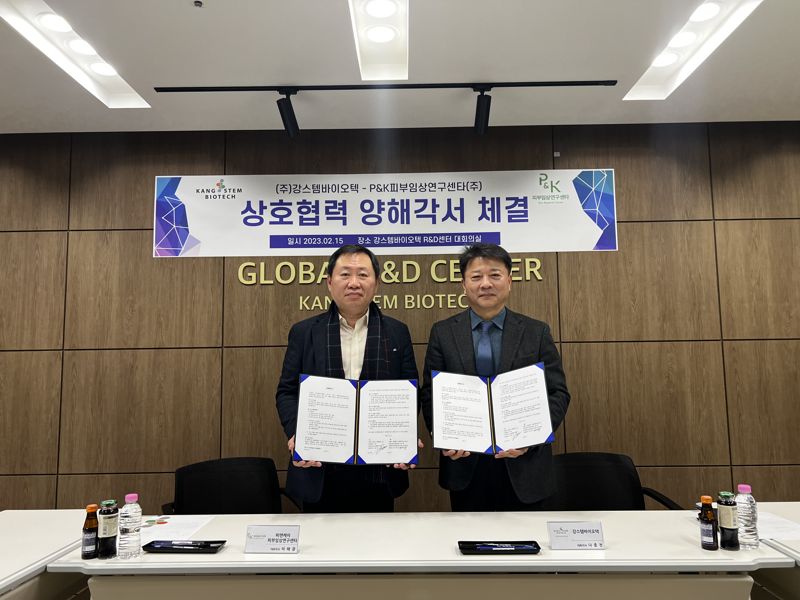 이해광 피엔케이피부임상연구센타 대표(왼쪽)와 나종천 강스템바이오텍 대표(오른쪽)가 지난 15일 피부 오가노이드 기반으로 하는 효능평가 플랫폼 개발 및 사업화 등에 관한 전략적 업무협약을 체결했다. P&K 제공.