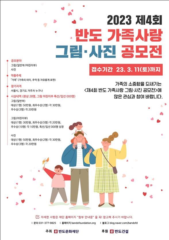 [파이낸셜뉴스] 반도문화재단은 다음달 11일까지 '제4회 반도 가족사랑 그림·사진 공모전'을 개최한다고 27일 밝혔다.