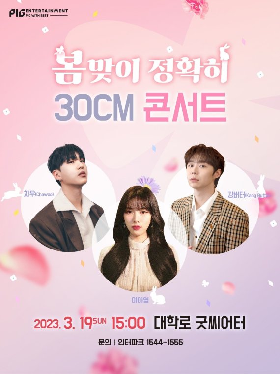PIG엔터테인먼트 소속 가수들이 봄의 시작을 알린다.PIG엔터테인먼트에 따르면 이아영과 차우, 강버터가 오는 19일 오후 3시 서울 종로구 혜화동의 대학로 굿씨어터에서 '2023년 봄맞이 정확히 30cm 콘서트'를 개최한다.발라드, 얼반, R&B 신에서 각광받고 있는 세 명의 신예 아티스트들을 한자리에서 만나볼 수 있는 기회란 점에서 벌써부터 음악 팬들의 관심이 뜨겁다.