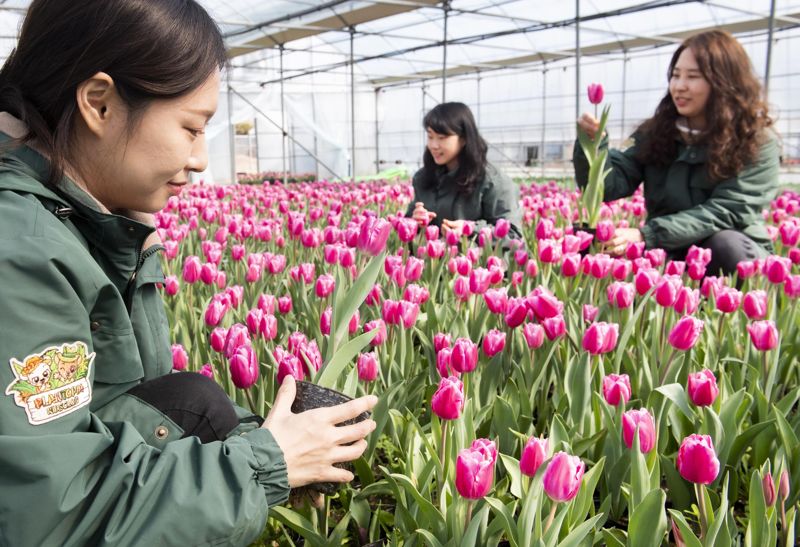 삼성물산 리조트부문 에버랜드 직원들이 6일 식물재배 하우스에서 오는 17일 오픈하는 '페어리타운'에서 선보일 튤립들을 살펴보고 있다. 삼성물산 제공