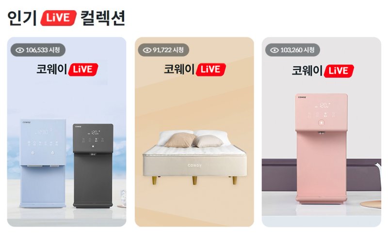 그동안 코웨이 라이브는 △아이콘 정수기2 △에어카트리지 공기청정기 △더블케어 비데 △원바디 매트리스 등 총 26회 방송을 진행했다. 특히 지난해 8월 진행한 아이콘 정수기2 방송에서는 최고 시청 수인 10만뷰를 기록하기도 했다.