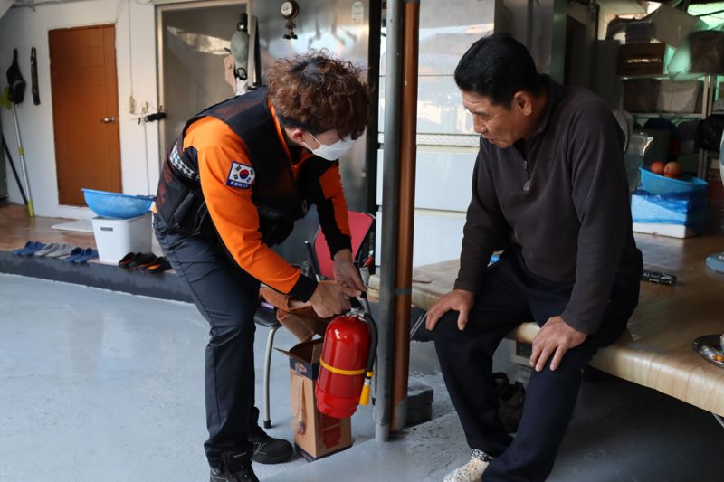 전남소방본부가 소화기, 화재알림경보기, 가스타이머 콕 등 안전시설 3종을 설치하고, 주택 안전점검과 화재 예방교육을 제공하는 '주택화재 안전 꾸러미'를 고향사랑기부금 답례품으로 선정했다. 사진은 소방대원이 도민에게 소화기 사용법을 설명하고 있는 모습. 사진=전남소방본부 제공