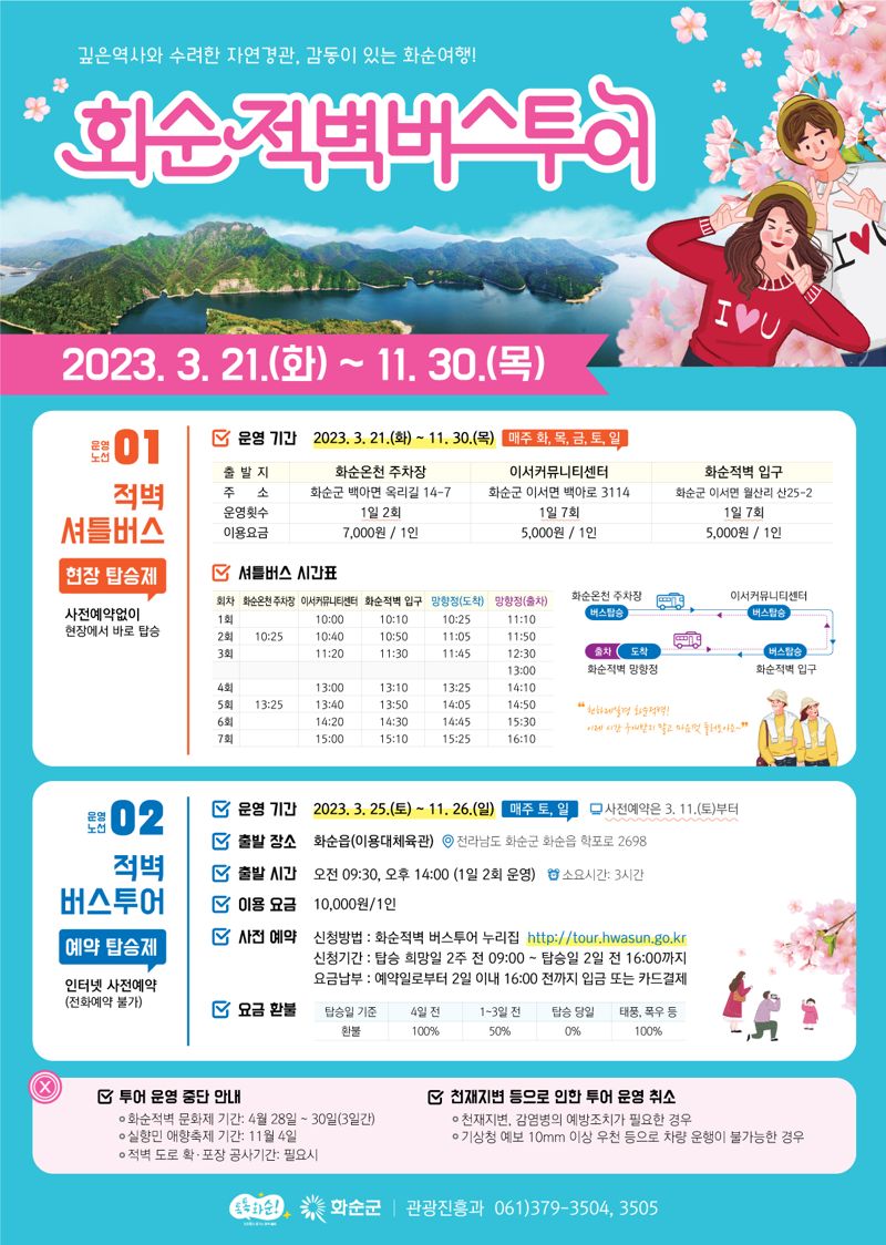 올해 새롭게 재개되는 화순적벽 버스투어는 기존 사전예약제인 '화순적벽 버스투어(화순읍 이용대체육관 출발)'와 사전예약 없이 현장 탑승으로 진행되는 '적벽 셔틀버스'를 병행해 운영된다.