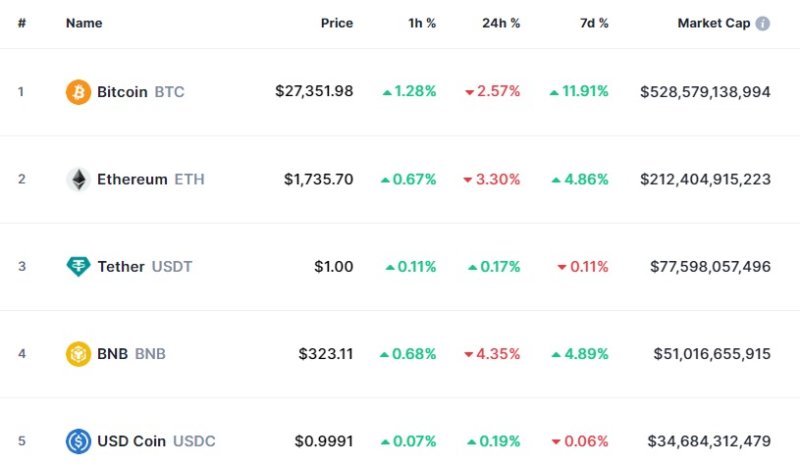 비트코인은 23일 오전 6시 현재(한국시간 기준) 글로벌 코인시황 중계사이트인 코인마켓캡에서 24시간 전보다 2.57% 하락한 2만7351달러를 기록하고 있다.