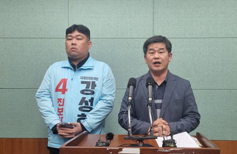 30일 전북도의회에서 진보당 강성희 후보 선대본의 전권희 정책위원장(우)이 기자회견을 갖고 의혹을 부인하고 있다. /사진=뉴스1