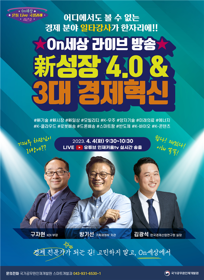 국가공무원인재개발원은 경제정책 실시간 공개방송을 4일 오전 9시 30분부터 '인재키움tv' 유튜브 채널을 통해 진행하겠다고 밝혔다. 핵심 국정과제인 경제활성화에 대한 일반 국민과 공직자들의 이해를 높이기 위함이다.
