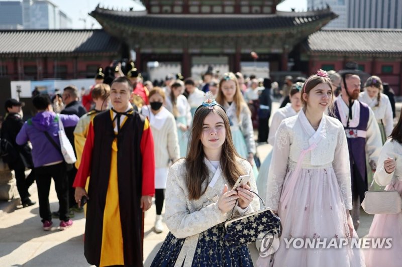완연한 봄 날씨를 보인 지난달 27일 오후 경복궁이 한복을 입은 외국인 관광객들로 북적이고 있다. 사진=연합뉴스