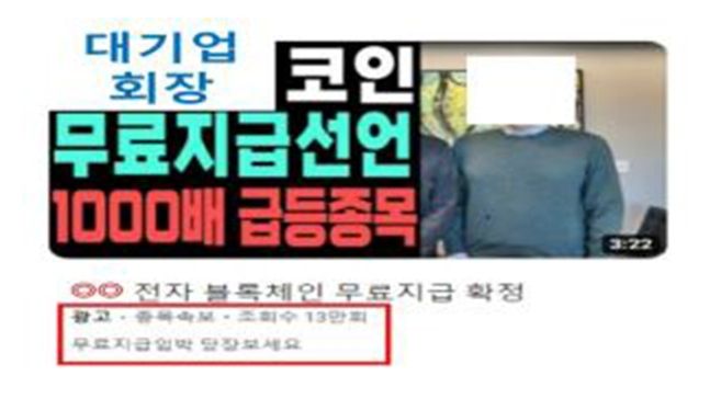특히 유튜브 등 SNS를 통해 국내 대기업 총수가 투자한 코인이라는 '가짜 정보'를 앞세워 일대일 대화방으로 유인하는 사례가 늘어나고 있다. 한 업체는 이재용 삼성전자 회장이 투자한 코인이며 1000%의 수익률을 보장한다는 허위 내용의 광고로 수십만회 이상 조회수를 기록하기도 했다. A씨는 이같은 게시물에 현혹돼 담당자가 안내한 계좌로 현금 1000만원을 입금했다가 업체와 연락이 끊겼다.