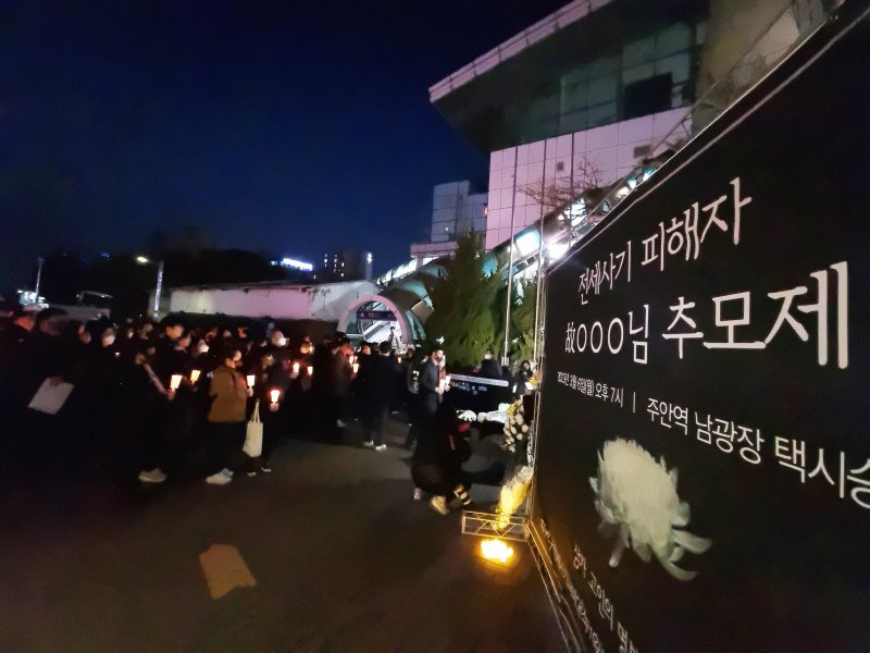 [인천=뉴시스] 김동영 기자 = 미추홀구 전세사기 피해 대책위원회가 6일 오후 인천 미추홀구 수도권 전철 1호선 주안역 앞에서 이른바 ‘건축왕’으로 불리는 건축업자에게 피해를 입어 극단적 선택을 한 30대 남성의 추모제를 열고 있다. 주안역을 통해 퇴근길에 오른 시민들은 발걸음을 멈춰 이 남성의 넋을 기렸다. 2023.03.06. dy0121@newsis.com /사진=뉴시스