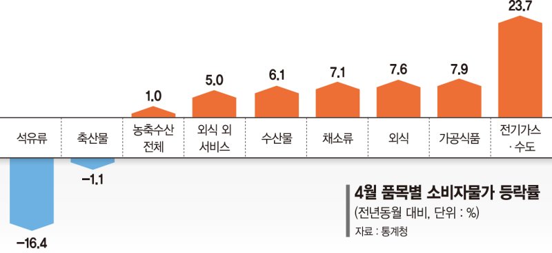 개인서비스 물가(상승률 6.1%)가 여전히 높은 수준을 보인 영향이다. 햄버거(17.1%) 등 외식물가가 7.6% 오른 데 이어 보험서비스료(17.6%), 공동주택관리비(5.3%) 등 외식 외 서비스 물가도 5.0% 올랐다. 인건비·재료비 상승이 물가에 반영된 것으로 보인다.