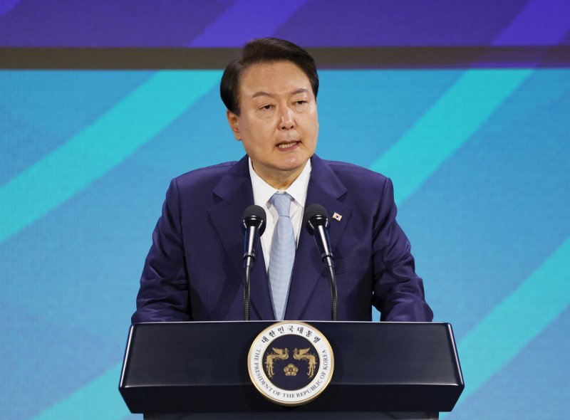 [인천=뉴시스] 홍효식 기자 = 윤석열 대통령이 3일 인천 송도 컨벤시아에서 열린 제56차 아시아개발은행(ADB) 연차총회 개회식에서 축사하고 있다. (대통령실통신사진기자단) 2023.05.03. yesphoto@newsis.com /사진=뉴시스