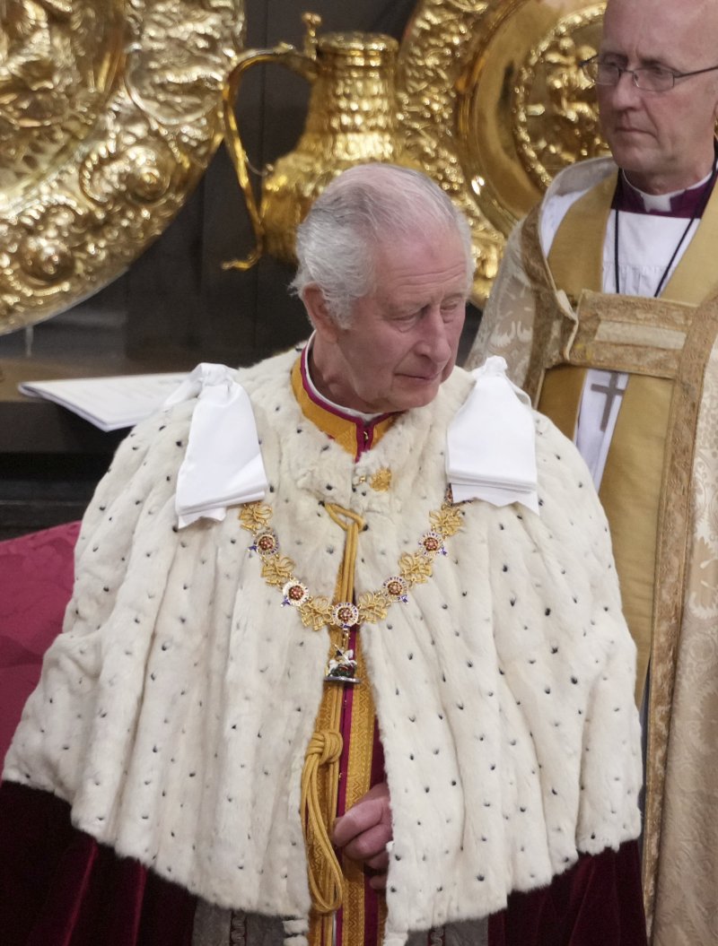 영국의 찰스 3세가 6일(현지시간) 수도 런던 웨스트민스터 사원에서 대관식을 진행하고 있다.AP뉴시스