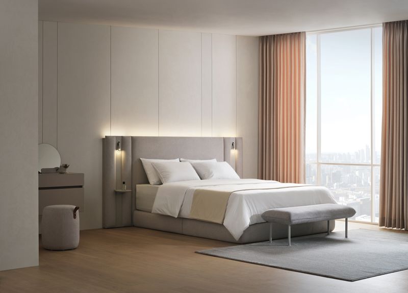 침대 헤드보드에는 바 형태의 LED 무드등과 USB 포트가 내장되어 있어 양 옆의 패널 없이도 무드 있는 침실 분위기를 연출할 수 있다. 헤드보드 무드등의 경우 헤드보드에서 패널까지 이어지는 조명 라인이 로맨틱한 분위기를 더하는 것이 특징이며, 3단계 밝기 조절과 30분 취침 타이머 기능이 있어 라이프스타일에 맞춰 편리하게 사용이 가능하다. 침대 옆 패널은 일반형과 선반형 두 가지 옵션 중 선택할 수 있으며, 그레이 컬러의 패브릭과 목재, 샴페인 골드 컬러의 조명 등 다채로운 소재와 컬러가 믹스매치되어 호텔 침대만의 멋스러운 느낌을 완성해준다.