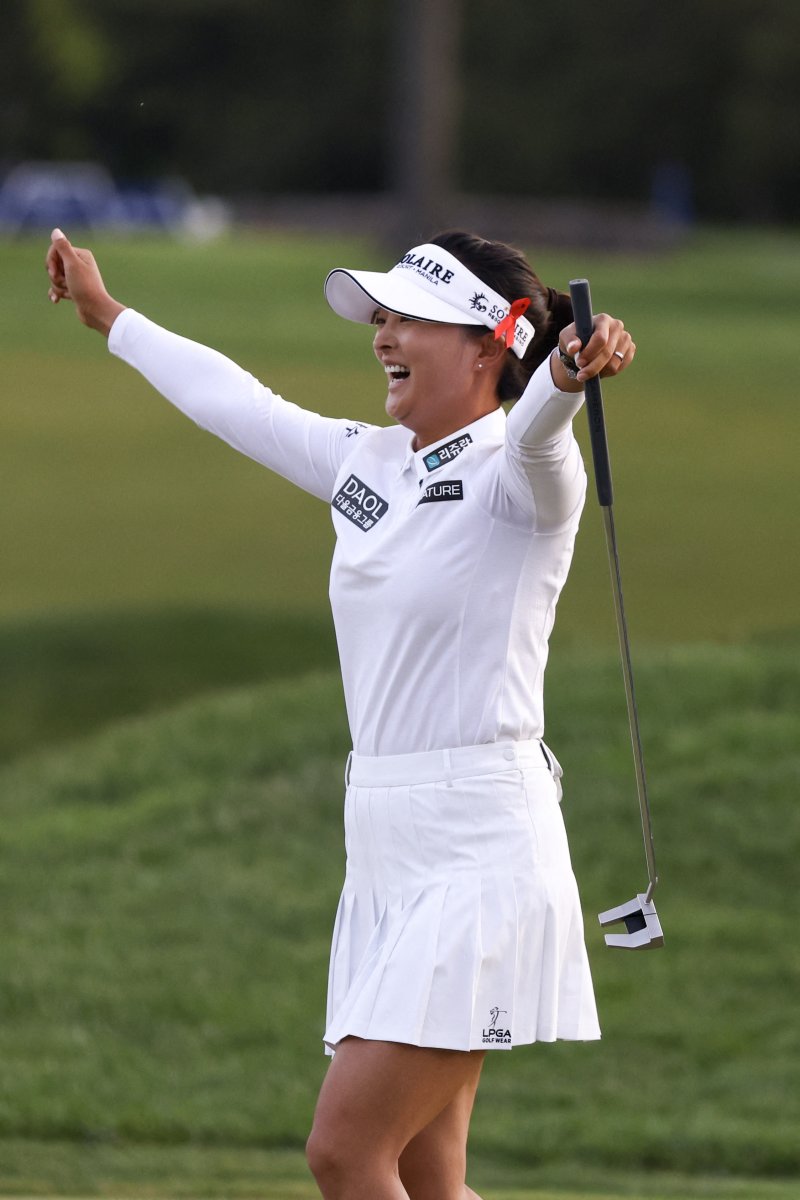 "내가 이겼어" 고진영이 14일(현지시간) 미 뉴저지주 클리프턴의 어퍼 몽클레어 컨트리클럽에서 열린 미국여자프로골프(LPGA)투어 코그니전트 파운더스컵에서 우승하며 환호하고 있다. 연합뉴스 AFP