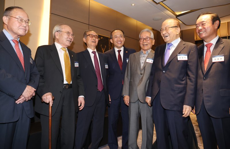 전현직 경제사령탑들 한자리에25일 서울 여의도 페어몬트호텔에서 열린 '경제개발 5개년계획 수립 60주년 기념 국제 컨퍼런스'에 참석한 추경호 경제부총리 겸 기획재정부 장관이 전직 경제 관련 부처장들과 환담을 하고 있다. 왼쪽부터 박재윤 전 통상산업부 장관, 이동호 전 내무부 장관, 전윤철 전 재정경제부 장관, 추 부총리, 진념 전 재정경제부 장관, 강경식 전 재정경제원 장관, 장병완 전 기획예산처 장관 연합뉴스