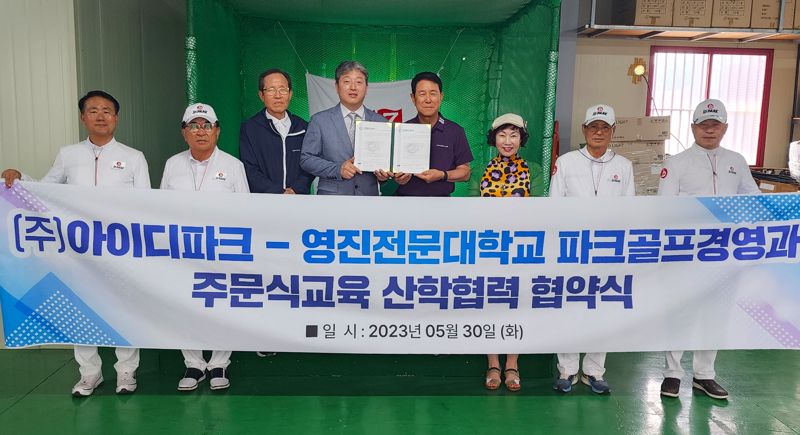 영진전문대 파크골프경영과와 ㈜아이디파크는 지난 30일 아이디파크에서 주문식교육 협약을 체결한 뒤 관계자들이 포즈를 취했다.