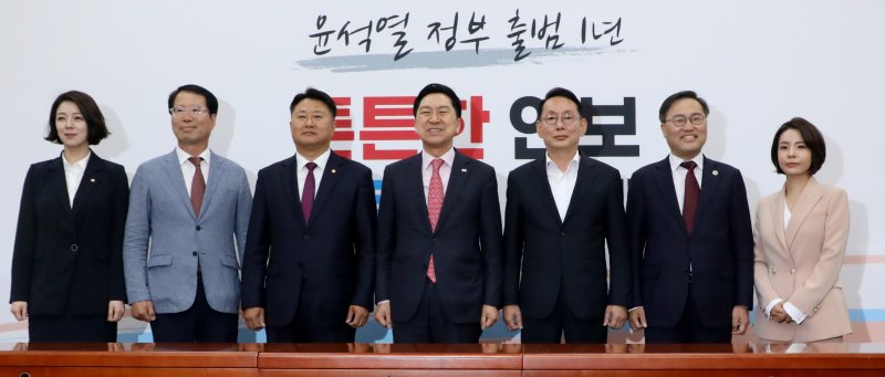 김기현 국민의힘 대표가 15일 오전 서울 여의도 국회에서 열린 최고위원 보궐선거 선거관리위원회 임명장 수여식에서 김도읍 선거관리위원장 등 위원들과 기념촬영을 하고 있다. 왼쪽부터 배현진 선관위원, 양홍규, 노용호, 김 대표, 김 위원장, 홍석준, 함인경.사진=뉴스1