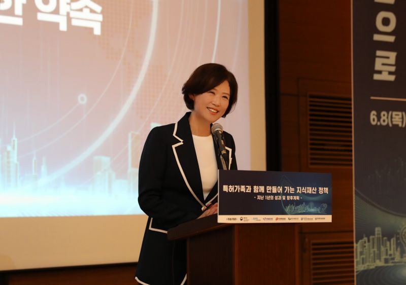 이인실 특허청장이 8일 새정부 출범 1주년을 맞아 대전 유성 ICC에서 열린 '지식재산 정책 추진성과와 향후 계획' 발표 행사에서 그간 추진한 특허청 사업 성과 등을 소개하고 있다.