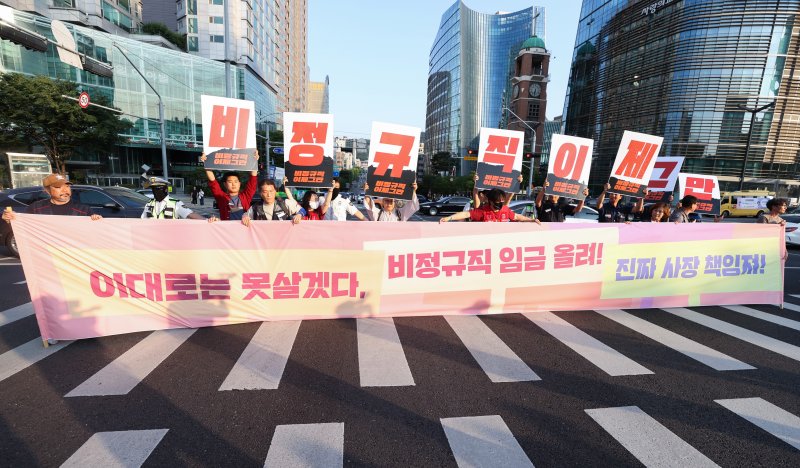 '비정규직 이제그만 공동투쟁' 관계자들이 지난 9일 오후 서울 서초구 대법원 인근 횡단보도에서 비정규직 문제 해결을 촉구하는 손팻말을 들고 현수막을 펼치고 있다. /사진=연합뉴스