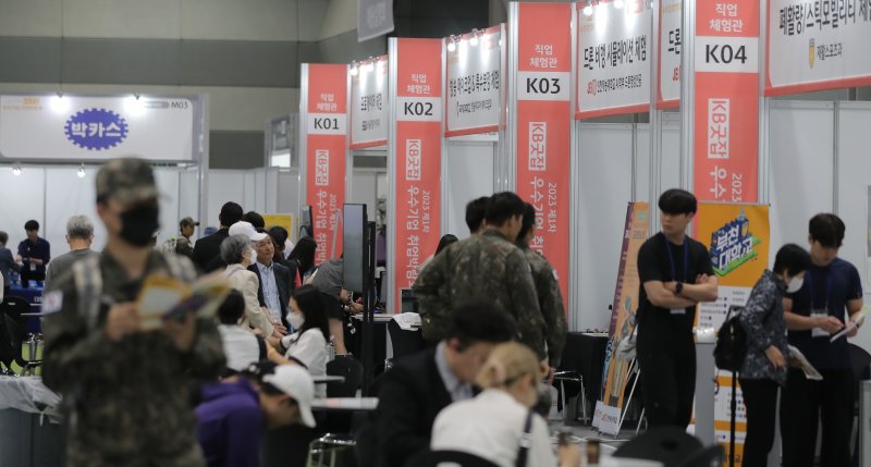 [서울=뉴시스] 김금보 기자 = 서울 강남구 코엑스에서 '2023 제1차 KB굿잡 우수기업 취업박람회'가 열리고 있다. 2023.05.22. kgb@newsis.com /사진=뉴시스