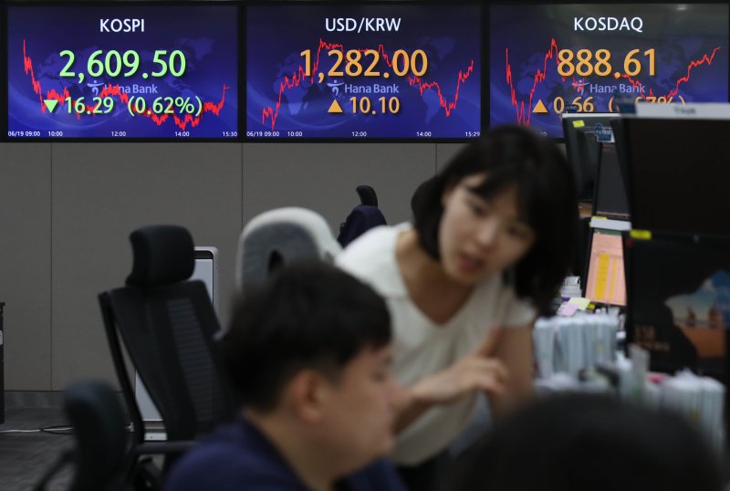 지난 19일 오후 서울 중구 하나은행 딜링룸 전광판에 종가지수가 표시되고 있다. 뉴시스 제공