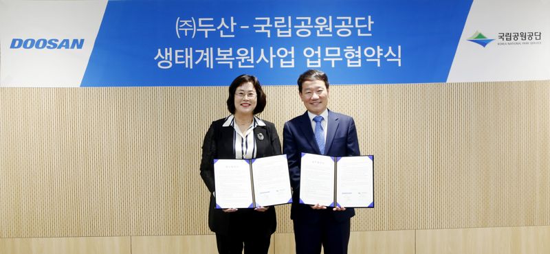 두산은 국립공원공단과 생태계 복원 사업을 위한 업무협약(MOU)을 체결했다고 20일 밝혔다. 서울 동대문 두산타워에서 전날 열린 협약 체결식에는 박영호 두산 부사장, 손영임 국립공원공단 자원보전이사 등 관계자들이 참석했다.