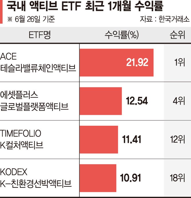 27일 한국거래소에 따르면 국내 726개 ETF 가운데 최근 1개월 수익률(26일 기준) 선두는 'ACE 테슬라밸류체인액티브(21.92%)'가 차지했다. 테슬라를 비롯해 전기차 및 반도체 상위 기업으로 구성된 비교지수(Bloomberg EV Supporters Plus Tesla Price Return Index) 대비 초과 성과를 목표로 한다.