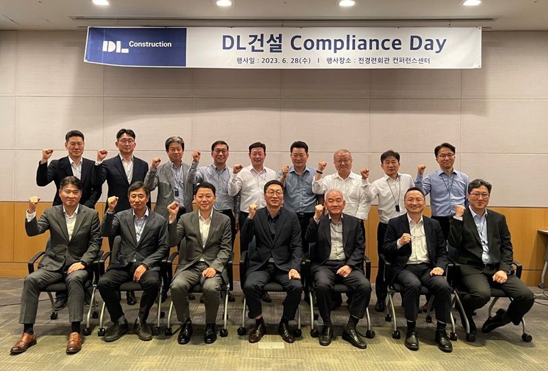 지난달 28일 서울 전경련회관 컨퍼런스센터에서 열린 '2023년 DL건설 컴플라이언스 데이' 행사에서 곽수윤 DL건설 대표이사(앞줄 가운데)를 비롯한 관계자들이 기념 촬영하고 있다. DL건설 제공