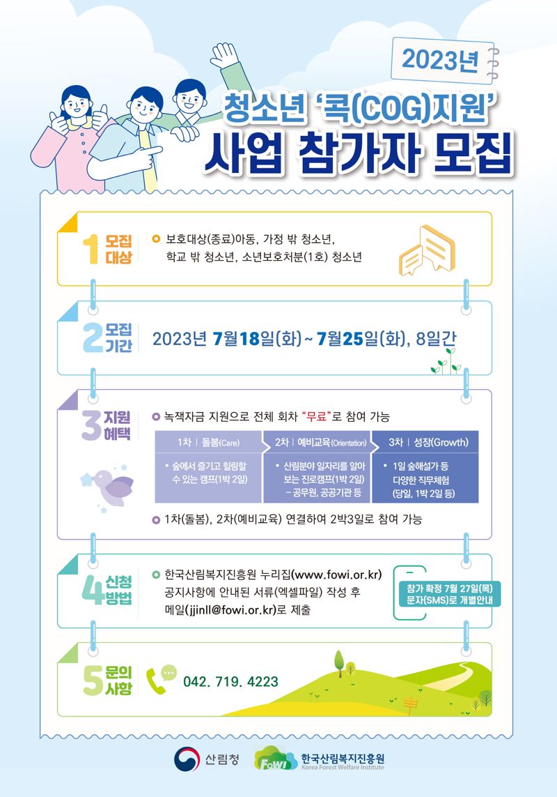[파이낸셜뉴스 대전=김원준 기자] 한국산림복지진흥원은 제도 밖 청소년의 자립역량 강화를 위한 단계별 산림교육 '2023년 콕(COG)지원 사업'을 운영한다고 11일 밝혔다.
