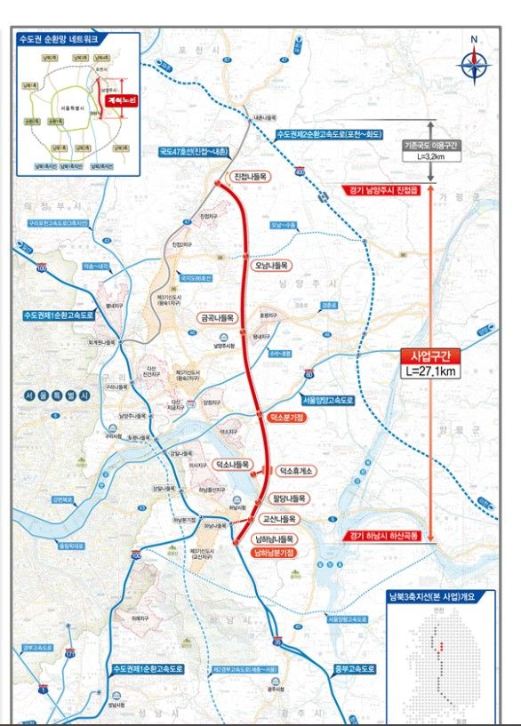 경기 하남시 하산곡동에서 남양주시 진접읍까지 27.1㎞ 구간에 왕복 4차로 규모다. 교량 11개, 터널 7개, 분기점(JC) 2개, 나들목(IC) 7개 등이 예정돼 있다. 이 사업은 (가칭)수도권동부고속도로의 제안으로 추진됐다.