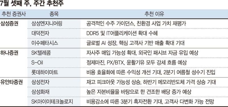 하나증권은 SK텔레콤을 추천했다. 회사채 발행금리를 고려하면 가을께 자사주 매입이 진행될 가능성이 매우 높고, 이익 전망치 상향 조정이 지속됨에 따라 외국인들의 패시브 자금 유입이 기대된다.