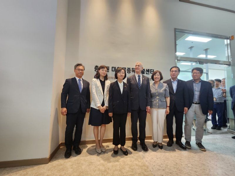 20일 대전 '충청권 중독재활센터'에서 오유경 식품의약품안전처장(왼쪽 세번째)과 미첼 넷번 사마리탄 데이탑 빌리지 회장(왼쪽 네번째) 등 관계자들이 기념사진을 찍고 있다. 사진=김동규 기자