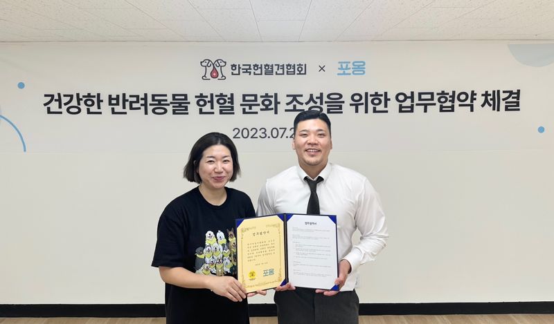 양사는 지난 22일 포옹 본사에서 업무 협약식을 갖고 공혈견 문제의 대안으로 반려견 헌혈 문화 확산을 위한 공동의 노력을 약속했다. 포옹은 헌혈견의 건강한 성장을 위해 포옹의 대표 프리미엄 자연식 자체브랜드(PB) 제품인 ‘생식선생’, ‘화식선생’ 제품을 지원한다. 헌혈에 동참한 헌혈견을 대상으로 한 마리당 2kg 이상의 제품을 제공하며 일회성에 그치지 않고 매년 4000만원 상당의 제품을 후원할 계획이다.