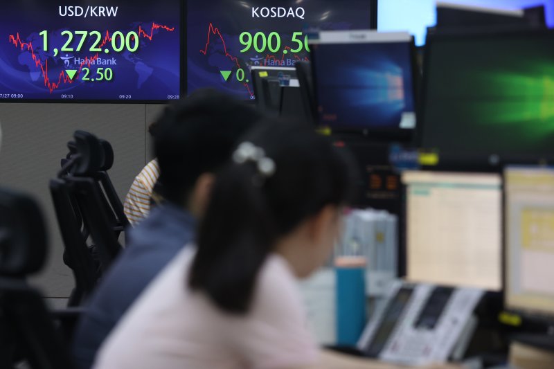 원/달러 환율이 하락 출발한 27일 오전 서울 중구 하나은행 본점 딜링룸에서 딜러들이 업무를 보고 있다. 원/달러 환율은 3.4원 내린 1,271.1원에 개장해 장 초반 1,260원대에서 움직이고 있다. 2023.7.27 연합뉴스