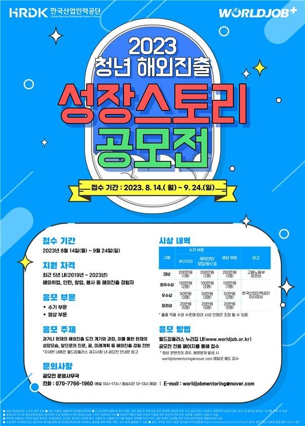 [파이낸셜뉴스] 한국산업인력공단은 오는 9월24일까지 '2023년 청년 해외 진출 성장스토리 공모전' 작품을 접수한다고 14일 밝혔다.