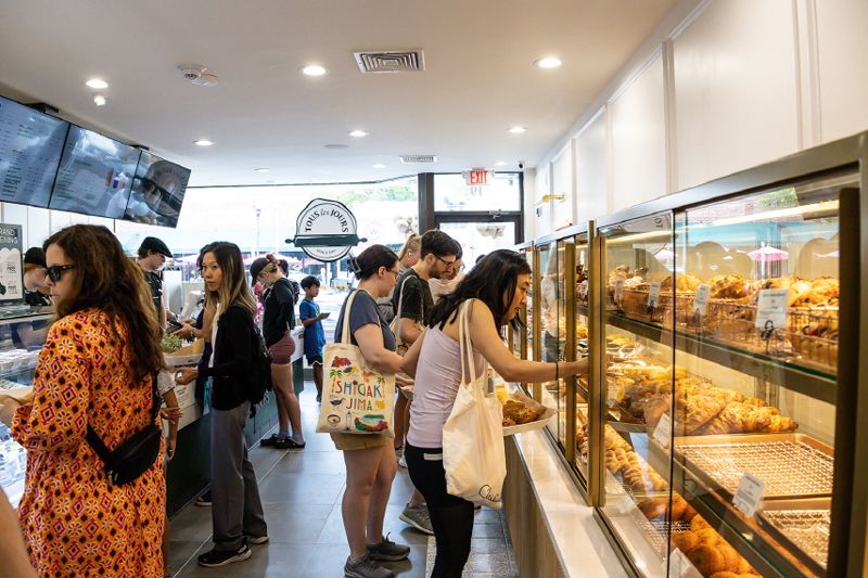 뚜레쥬르가 미국 현지에 100번째로 오픈한 뉴욕 맨허튼 인근 '브롱스빌 점'에서 고객들이 빵을 고르고 있다.