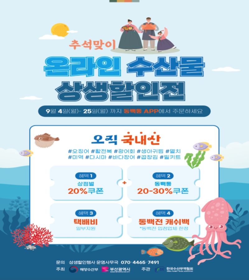 할인전은 부산시 공공배달앱 동백통에서 국내산 수산물을 구매하면 최대 50% 할인쿠폰과 무료배송 서비스를 제공한다.