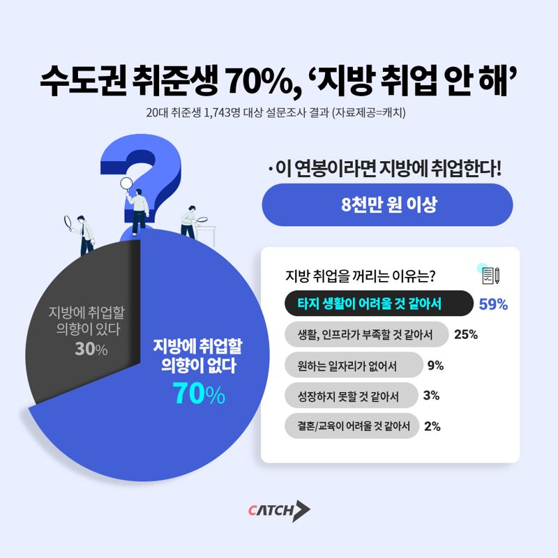 채용 콘텐츠 플랫폼 진학사 캐치가 22일 수도권 주요 대학 출신 20대 구직자 1743명을 대상으로 '지방 취업 선호도'에 관한 조사를 진행한 결과, 70%가 '지방에 취업할 의향이 없다'라고 응답했다.