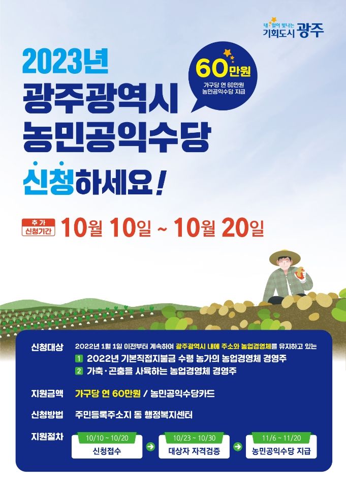 【파이낸셜뉴스 광주=황태종 기자】광주광역시가 특광역시 최초로 지난 9월 '농민공익수당'을 지급한 가운데 미처 신청하지 못한 농가를 지원하기 위해 오는 10~20일 추가 접수를 진행한다.
